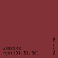 Цвет #833338 в цветовой модели RGB обозначается тремя октетами (131, 51, 56) в десятичном формате и #833338 в шестнадцатиричном (hex) формате, которые являются интенсивностью красного 131 (hex 83), интенсивность зелёного 51 (hex 33) и интенсивность синего 56 (hex 38).