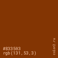 Цвет #833503 в цветовой модели RGB обозначается тремя октетами (131, 53, 3) в десятичном формате и #833503 в шестнадцатиричном (hex) формате, которые являются интенсивностью красного 131 (hex 83), интенсивность зелёного 53 (hex 35) и интенсивность синего 3 (hex 03).