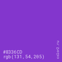 Цвет #8336CD в цветовой модели RGB обозначается тремя октетами (131, 54, 205) в десятичном формате и #8336CD в шестнадцатиричном (hex) формате, которые являются интенсивностью красного 131 (hex 83), интенсивность зелёного 54 (hex 36) и интенсивность синего 205 (hex CD).