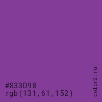 Цвет #833D98 в цветовой модели RGB обозначается тремя октетами (131, 61, 152) в десятичном формате и #833D98 в шестнадцатиричном (hex) формате, которые являются интенсивностью красного 131 (hex 83), интенсивность зелёного 61 (hex 3D) и интенсивность синего 152 (hex 98).