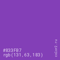 Цвет #833FB7 в цветовой модели RGB обозначается тремя октетами (131, 63, 183) в десятичном формате и #833FB7 в шестнадцатиричном (hex) формате, которые являются интенсивностью красного 131 (hex 83), интенсивность зелёного 63 (hex 3F) и интенсивность синего 183 (hex B7).