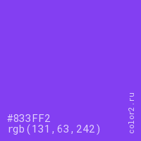 Цвет #833FF2 в цветовой модели RGB обозначается тремя октетами (131, 63, 242) в десятичном формате и #833FF2 в шестнадцатиричном (hex) формате, которые являются интенсивностью красного 131 (hex 83), интенсивность зелёного 63 (hex 3F) и интенсивность синего 242 (hex F2).