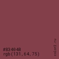 Цвет #83404B в цветовой модели RGB обозначается тремя октетами (131, 64, 75) в десятичном формате и #83404B в шестнадцатиричном (hex) формате, которые являются интенсивностью красного 131 (hex 83), интенсивность зелёного 64 (hex 40) и интенсивность синего 75 (hex 4B).