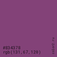Цвет #834378 в цветовой модели RGB обозначается тремя октетами (131, 67, 120) в десятичном формате и #834378 в шестнадцатиричном (hex) формате, которые являются интенсивностью красного 131 (hex 83), интенсивность зелёного 67 (hex 43) и интенсивность синего 120 (hex 78).