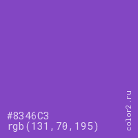 Цвет #8346C3 в цветовой модели RGB обозначается тремя октетами (131, 70, 195) в десятичном формате и #8346C3 в шестнадцатиричном (hex) формате, которые являются интенсивностью красного 131 (hex 83), интенсивность зелёного 70 (hex 46) и интенсивность синего 195 (hex C3).