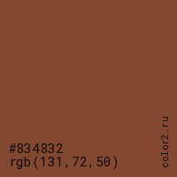 Цвет #834832 в цветовой модели RGB обозначается тремя октетами (131, 72, 50) в десятичном формате и #834832 в шестнадцатиричном (hex) формате, которые являются интенсивностью красного 131 (hex 83), интенсивность зелёного 72 (hex 48) и интенсивность синего 50 (hex 32).