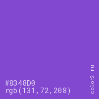 Цвет #8348D0 в цветовой модели RGB обозначается тремя октетами (131, 72, 208) в десятичном формате и #8348D0 в шестнадцатиричном (hex) формате, которые являются интенсивностью красного 131 (hex 83), интенсивность зелёного 72 (hex 48) и интенсивность синего 208 (hex D0).