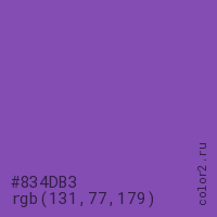 Цвет #834DB3 в цветовой модели RGB обозначается тремя октетами (131, 77, 179) в десятичном формате и #834DB3 в шестнадцатиричном (hex) формате, которые являются интенсивностью красного 131 (hex 83), интенсивность зелёного 77 (hex 4D) и интенсивность синего 179 (hex B3).