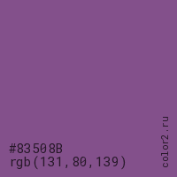 Цвет #83508B в цветовой модели RGB обозначается тремя октетами (131, 80, 139) в десятичном формате и #83508B в шестнадцатиричном (hex) формате, которые являются интенсивностью красного 131 (hex 83), интенсивность зелёного 80 (hex 50) и интенсивность синего 139 (hex 8B).