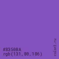 Цвет #8350BA в цветовой модели RGB обозначается тремя октетами (131, 80, 186) в десятичном формате и #8350BA в шестнадцатиричном (hex) формате, которые являются интенсивностью красного 131 (hex 83), интенсивность зелёного 80 (hex 50) и интенсивность синего 186 (hex BA).