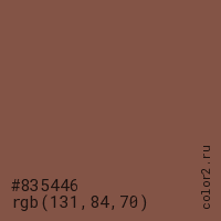 Цвет #835446 в цветовой модели RGB обозначается тремя октетами (131, 84, 70) в десятичном формате и #835446 в шестнадцатиричном (hex) формате, которые являются интенсивностью красного 131 (hex 83), интенсивность зелёного 84 (hex 54) и интенсивность синего 70 (hex 46).
