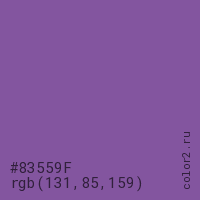 Цвет #83559F в цветовой модели RGB обозначается тремя октетами (131, 85, 159) в десятичном формате и #83559F в шестнадцатиричном (hex) формате, которые являются интенсивностью красного 131 (hex 83), интенсивность зелёного 85 (hex 55) и интенсивность синего 159 (hex 9F).