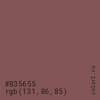 Цвет #835655 в цветовой модели RGB обозначается тремя октетами (131, 86, 85) в десятичном формате и #835655 в шестнадцатиричном (hex) формате, которые являются интенсивностью красного 131 (hex 83), интенсивность зелёного 86 (hex 56) и интенсивность синего 85 (hex 55).