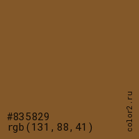 Цвет #835829 в цветовой модели RGB обозначается тремя октетами (131, 88, 41) в десятичном формате и #835829 в шестнадцатиричном (hex) формате, которые являются интенсивностью красного 131 (hex 83), интенсивность зелёного 88 (hex 58) и интенсивность синего 41 (hex 29).