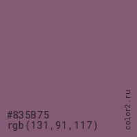 Цвет #835B75 в цветовой модели RGB обозначается тремя октетами (131, 91, 117) в десятичном формате и #835B75 в шестнадцатиричном (hex) формате, которые являются интенсивностью красного 131 (hex 83), интенсивность зелёного 91 (hex 5B) и интенсивность синего 117 (hex 75).