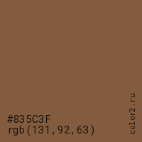 Цвет #835C3F в цветовой модели RGB обозначается тремя октетами (131, 92, 63) в десятичном формате и #835C3F в шестнадцатиричном (hex) формате, которые являются интенсивностью красного 131 (hex 83), интенсивность зелёного 92 (hex 5C) и интенсивность синего 63 (hex 3F).