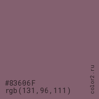 Цвет #83606F в цветовой модели RGB обозначается тремя октетами (131, 96, 111) в десятичном формате и #83606F в шестнадцатиричном (hex) формате, которые являются интенсивностью красного 131 (hex 83), интенсивность зелёного 96 (hex 60) и интенсивность синего 111 (hex 6F).