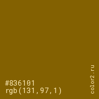 Цвет #836101 в цветовой модели RGB обозначается тремя октетами (131, 97, 1) в десятичном формате и #836101 в шестнадцатиричном (hex) формате, которые являются интенсивностью красного 131 (hex 83), интенсивность зелёного 97 (hex 61) и интенсивность синего 1 (hex 01).