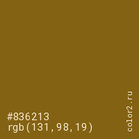 Цвет #836213 в цветовой модели RGB обозначается тремя октетами (131, 98, 19) в десятичном формате и #836213 в шестнадцатиричном (hex) формате, которые являются интенсивностью красного 131 (hex 83), интенсивность зелёного 98 (hex 62) и интенсивность синего 19 (hex 13).