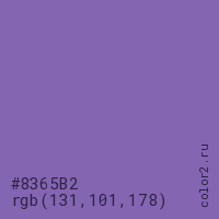 Цвет #8365B2 в цветовой модели RGB обозначается тремя октетами (131, 101, 178) в десятичном формате и #8365B2 в шестнадцатиричном (hex) формате, которые являются интенсивностью красного 131 (hex 83), интенсивность зелёного 101 (hex 65) и интенсивность синего 178 (hex B2).