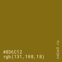 Цвет #836C12 в цветовой модели RGB обозначается тремя октетами (131, 108, 18) в десятичном формате и #836C12 в шестнадцатиричном (hex) формате, которые являются интенсивностью красного 131 (hex 83), интенсивность зелёного 108 (hex 6C) и интенсивность синего 18 (hex 12).