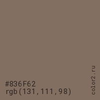 Цвет #836F62 в цветовой модели RGB обозначается тремя октетами (131, 111, 98) в десятичном формате и #836F62 в шестнадцатиричном (hex) формате, которые являются интенсивностью красного 131 (hex 83), интенсивность зелёного 111 (hex 6F) и интенсивность синего 98 (hex 62).