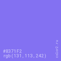 Цвет #8371F2 в цветовой модели RGB обозначается тремя октетами (131, 113, 242) в десятичном формате и #8371F2 в шестнадцатиричном (hex) формате, которые являются интенсивностью красного 131 (hex 83), интенсивность зелёного 113 (hex 71) и интенсивность синего 242 (hex F2).