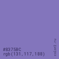 Цвет #8375BC в цветовой модели RGB обозначается тремя октетами (131, 117, 188) в десятичном формате и #8375BC в шестнадцатиричном (hex) формате, которые являются интенсивностью красного 131 (hex 83), интенсивность зелёного 117 (hex 75) и интенсивность синего 188 (hex BC).