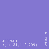 Цвет #8376D1 в цветовой модели RGB обозначается тремя октетами (131, 118, 209) в десятичном формате и #8376D1 в шестнадцатиричном (hex) формате, которые являются интенсивностью красного 131 (hex 83), интенсивность зелёного 118 (hex 76) и интенсивность синего 209 (hex D1).