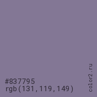 Цвет #837795 в цветовой модели RGB обозначается тремя октетами (131, 119, 149) в десятичном формате и #837795 в шестнадцатиричном (hex) формате, которые являются интенсивностью красного 131 (hex 83), интенсивность зелёного 119 (hex 77) и интенсивность синего 149 (hex 95).
