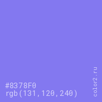 Цвет #8378F0 в цветовой модели RGB обозначается тремя октетами (131, 120, 240) в десятичном формате и #8378F0 в шестнадцатиричном (hex) формате, которые являются интенсивностью красного 131 (hex 83), интенсивность зелёного 120 (hex 78) и интенсивность синего 240 (hex F0).