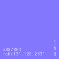 Цвет #8378FD в цветовой модели RGB обозначается тремя октетами (131, 120, 253) в десятичном формате и #8378FD в шестнадцатиричном (hex) формате, которые являются интенсивностью красного 131 (hex 83), интенсивность зелёного 120 (hex 78) и интенсивность синего 253 (hex FD).