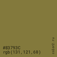 Цвет #83793C в цветовой модели RGB обозначается тремя октетами (131, 121, 60) в десятичном формате и #83793C в шестнадцатиричном (hex) формате, которые являются интенсивностью красного 131 (hex 83), интенсивность зелёного 121 (hex 79) и интенсивность синего 60 (hex 3C).