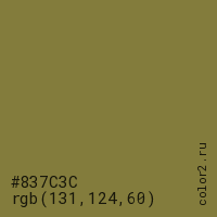 Цвет #837C3C в цветовой модели RGB обозначается тремя октетами (131, 124, 60) в десятичном формате и #837C3C в шестнадцатиричном (hex) формате, которые являются интенсивностью красного 131 (hex 83), интенсивность зелёного 124 (hex 7C) и интенсивность синего 60 (hex 3C).