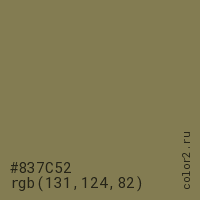 Цвет #837C52 в цветовой модели RGB обозначается тремя октетами (131, 124, 82) в десятичном формате и #837C52 в шестнадцатиричном (hex) формате, которые являются интенсивностью красного 131 (hex 83), интенсивность зелёного 124 (hex 7C) и интенсивность синего 82 (hex 52).