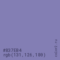Цвет #837EB4 в цветовой модели RGB обозначается тремя октетами (131, 126, 180) в десятичном формате и #837EB4 в шестнадцатиричном (hex) формате, которые являются интенсивностью красного 131 (hex 83), интенсивность зелёного 126 (hex 7E) и интенсивность синего 180 (hex B4).