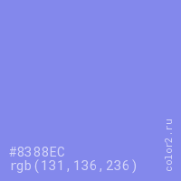 Цвет #8388EC в цветовой модели RGB обозначается тремя октетами (131, 136, 236) в десятичном формате и #8388EC в шестнадцатиричном (hex) формате, которые являются интенсивностью красного 131 (hex 83), интенсивность зелёного 136 (hex 88) и интенсивность синего 236 (hex EC).