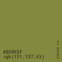 Цвет #83893F в цветовой модели RGB обозначается тремя октетами (131, 137, 63) в десятичном формате и #83893F в шестнадцатиричном (hex) формате, которые являются интенсивностью красного 131 (hex 83), интенсивность зелёного 137 (hex 89) и интенсивность синего 63 (hex 3F).