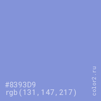Цвет #8393D9 в цветовой модели RGB обозначается тремя октетами (131, 147, 217) в десятичном формате и #8393D9 в шестнадцатиричном (hex) формате, которые являются интенсивностью красного 131 (hex 83), интенсивность зелёного 147 (hex 93) и интенсивность синего 217 (hex D9).