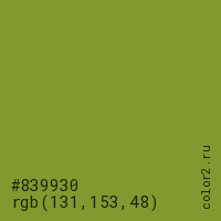Цвет #839930 в цветовой модели RGB обозначается тремя октетами (131, 153, 48) в десятичном формате и #839930 в шестнадцатиричном (hex) формате, которые являются интенсивностью красного 131 (hex 83), интенсивность зелёного 153 (hex 99) и интенсивность синего 48 (hex 30).