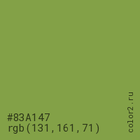 Цвет #83A147 в цветовой модели RGB обозначается тремя октетами (131, 161, 71) в десятичном формате и #83A147 в шестнадцатиричном (hex) формате, которые являются интенсивностью красного 131 (hex 83), интенсивность зелёного 161 (hex A1) и интенсивность синего 71 (hex 47).