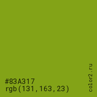 Цвет #83A317 в цветовой модели RGB обозначается тремя октетами (131, 163, 23) в десятичном формате и #83A317 в шестнадцатиричном (hex) формате, которые являются интенсивностью красного 131 (hex 83), интенсивность зелёного 163 (hex A3) и интенсивность синего 23 (hex 17).