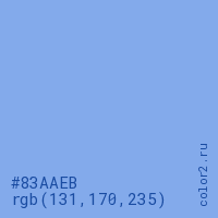 Цвет #83AAEB в цветовой модели RGB обозначается тремя октетами (131, 170, 235) в десятичном формате и #83AAEB в шестнадцатиричном (hex) формате, которые являются интенсивностью красного 131 (hex 83), интенсивность зелёного 170 (hex AA) и интенсивность синего 235 (hex EB).
