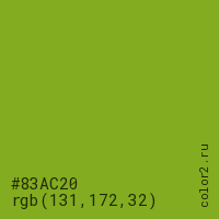 Цвет #83AC20 в цветовой модели RGB обозначается тремя октетами (131, 172, 32) в десятичном формате и #83AC20 в шестнадцатиричном (hex) формате, которые являются интенсивностью красного 131 (hex 83), интенсивность зелёного 172 (hex AC) и интенсивность синего 32 (hex 20).