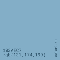 Цвет #83AEC7 в цветовой модели RGB обозначается тремя октетами (131, 174, 199) в десятичном формате и #83AEC7 в шестнадцатиричном (hex) формате, которые являются интенсивностью красного 131 (hex 83), интенсивность зелёного 174 (hex AE) и интенсивность синего 199 (hex C7).