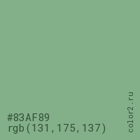 Цвет #83AF89 в цветовой модели RGB обозначается тремя октетами (131, 175, 137) в десятичном формате и #83AF89 в шестнадцатиричном (hex) формате, которые являются интенсивностью красного 131 (hex 83), интенсивность зелёного 175 (hex AF) и интенсивность синего 137 (hex 89).