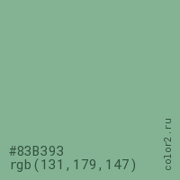 Цвет #83B393 в цветовой модели RGB обозначается тремя октетами (131, 179, 147) в десятичном формате и #83B393 в шестнадцатиричном (hex) формате, которые являются интенсивностью красного 131 (hex 83), интенсивность зелёного 179 (hex B3) и интенсивность синего 147 (hex 93).