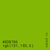 Цвет #83B706 в цветовой модели RGB обозначается тремя октетами (131, 183, 6) в десятичном формате и #83B706 в шестнадцатиричном (hex) формате, которые являются интенсивностью красного 131 (hex 83), интенсивность зелёного 183 (hex B7) и интенсивность синего 6 (hex 06).