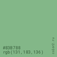 Цвет #83B788 в цветовой модели RGB обозначается тремя октетами (131, 183, 136) в десятичном формате и #83B788 в шестнадцатиричном (hex) формате, которые являются интенсивностью красного 131 (hex 83), интенсивность зелёного 183 (hex B7) и интенсивность синего 136 (hex 88).
