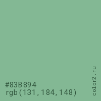 Цвет #83B894 в цветовой модели RGB обозначается тремя октетами (131, 184, 148) в десятичном формате и #83B894 в шестнадцатиричном (hex) формате, которые являются интенсивностью красного 131 (hex 83), интенсивность зелёного 184 (hex B8) и интенсивность синего 148 (hex 94).